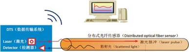 光纖測溫系統是基于光波散射技術的傳感監測系統,光纖既作為檢測單元又作為傳輸單元。利用光纖將待測對光纖內傳輸的光波參量進行調制,并對被調制過的光波信號進行解調檢測,從而獲得待測量。原理圖如下: